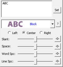 The envelope (containing top and bottom outlines) of the lettering (single or multi-line) can be individually customized. The Envelope Type box and Envelope Slider control the envelope. There is an Envelope Slider control for the envelope top and there is an envelope slider control for the envelope bottom. There are four styles of envelope: Curve, Grow, Peak and Shrink.
