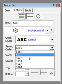 On the Letters tab there is a Sewing Order box. Choose the order in which the letters are sewn from this control. For a simple monogram you probably do not want to change the default order. However, if you want to overlap the center letter on the others, you could choose the ‘ACB’ order (second choice).