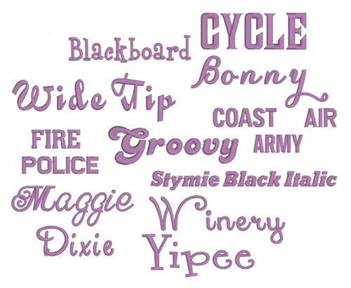 For fun, there is a collection of fonts with various styles from swirly, retro to motorcycle. One major benefit of this set is that a patch can be made, one that exactly outlines a name made using the fonts.