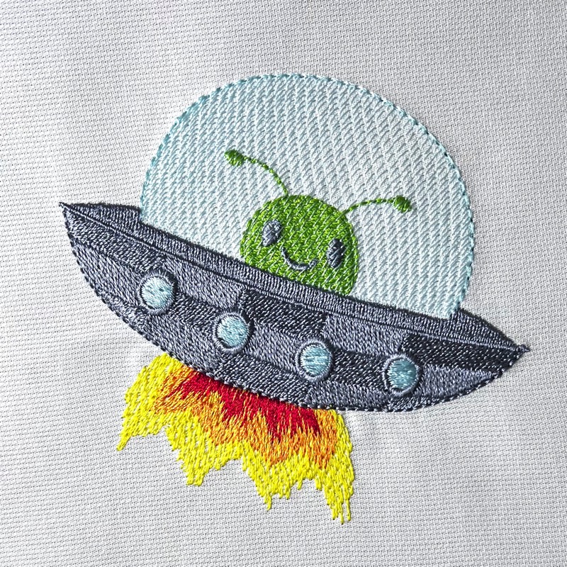 At first glance, the body of the spaceship looks like it’s stitched with two different thread colors. Plot twist: it’s not. This is all about stitch angle. Inspiration for this technique came from watching episodes from our friend Erich Campbell’s TakeUp that highlight the light effects of stitch angles. Especially his take on single-color designs and texture and this one on pixel art, as well as the Japanese Tatami Floormat artist he shared during one of his lives.