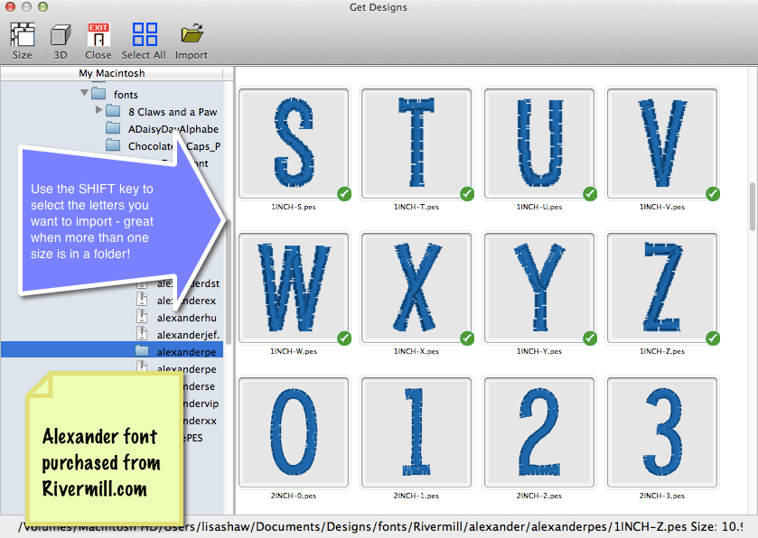 If your folder contains more than one size, you can use the SHIFT key and/or the Control/Command key to select only the files that you want to import. A green check mark displays on the selected designs so you know what will be brought into the mapping dialog when you click on the Import.