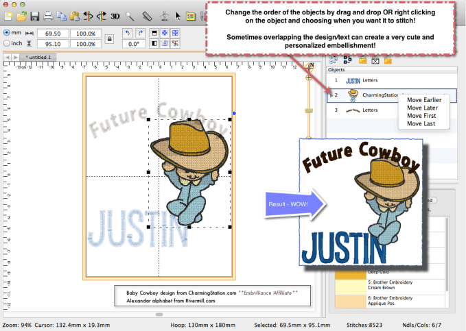 The object pane on the right hand side allows you to change the stitching order with a simple right click on the object and choosing a new location or by dragging and dropping the objects to new locations.