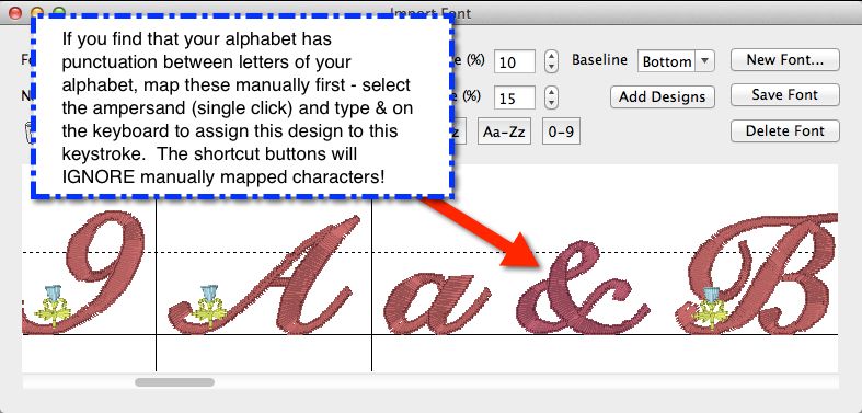 TIME SAVING TRICK!! Sometimes a designer will spell the character as the file name – for example ampersand.PES or period.PES or comma.PES. If you imported all the characters at one time, they are shown alphabetically which would put the ampersand.PES after the “small a” which is named aa.PES. If you were to click on the “A” and select the Aa-Zz button to map the alphabet, it would actually assign the keystroke of SHIFT+B, capital B, to the ampersand because it follows the pattern you have told it to expect.
