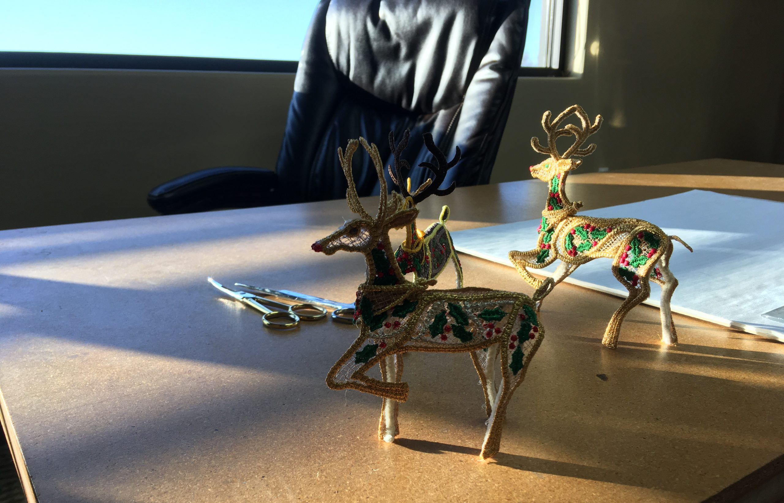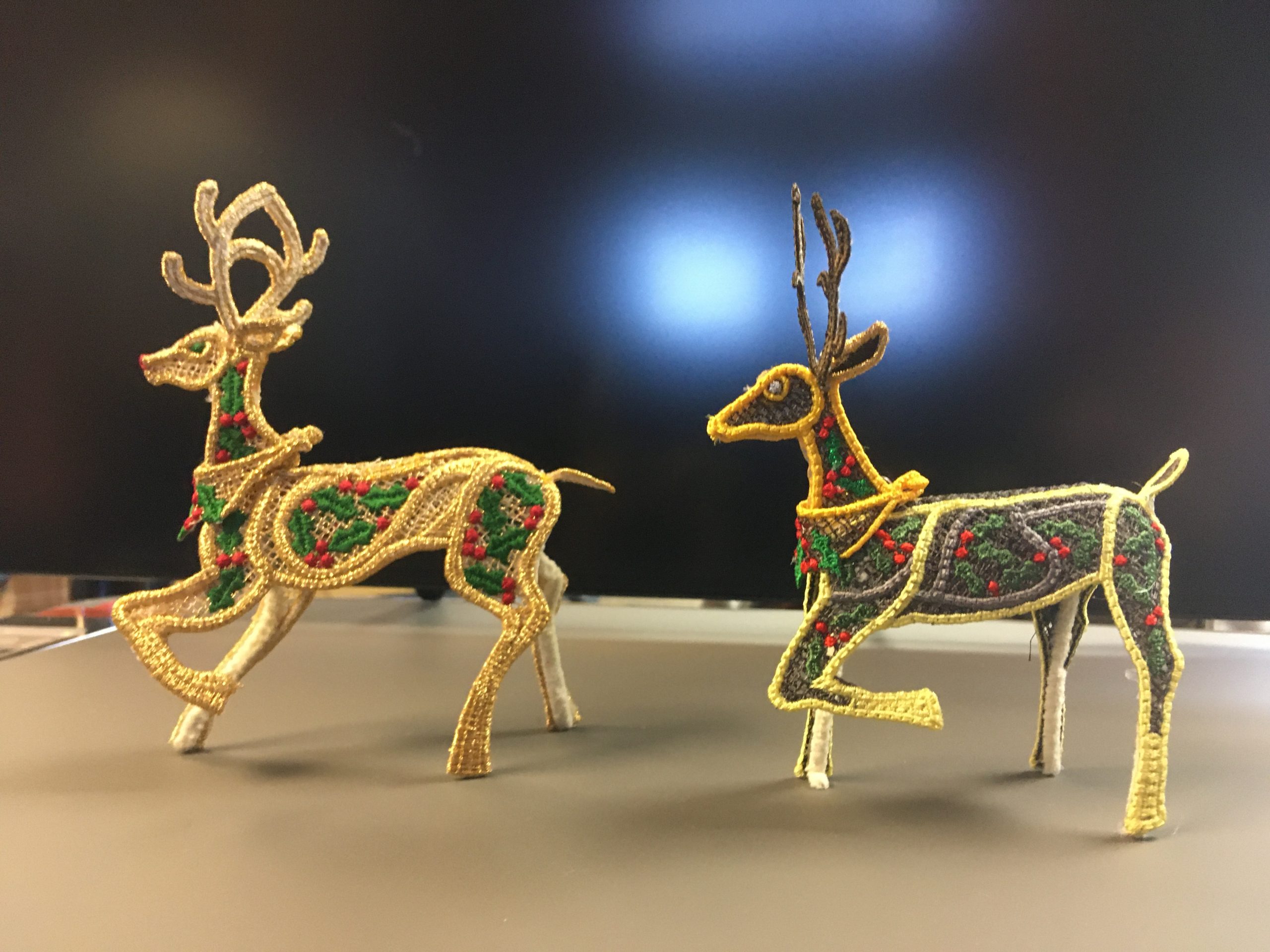 Once you have the pieces embroidered, you’ll have to attach them. We recommend doing this while the reindeer are slightly damp (not wet!) and still pliable.