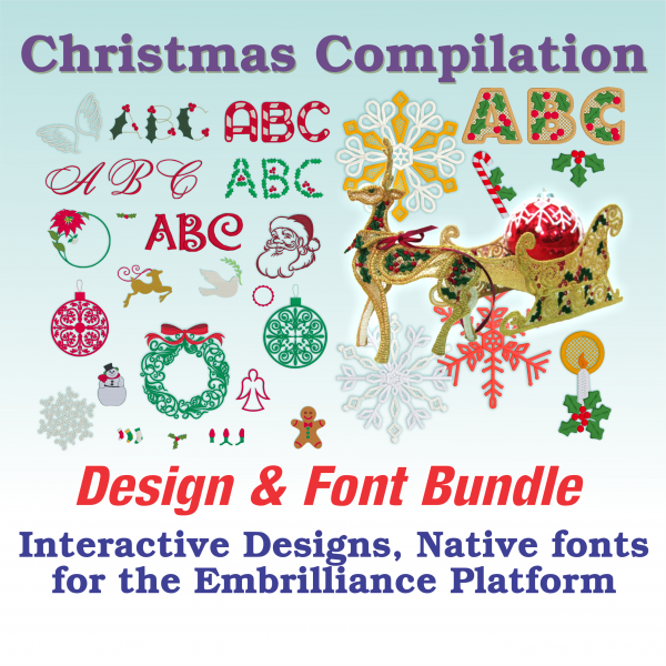 This bundle lets you add the 5 scalable, native holiday fonts and classic designs from the Christmas Collection 1 library and incredible interactive snowflake generator, ornament cover creator, and Santa’s reindeer and sleigh interactives as well as the freestanding lace holly font and bonus designs from the Christmas Tradition Interactive collection to your Embrilliance Platform for an unheard of value!