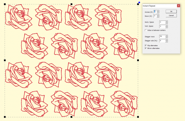 Repeats a design at a set quantity and spacing across and down, with additional controls to stagger, flip, and mirror designs.