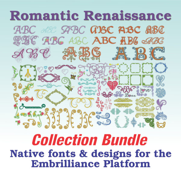 Embrilliance Romance Collection contains fonts and designs including updated favorites.  Updated for use with your Embrilliance Platform Programs, the collection was vastly expanded with all-new design and font creations! It contains 8 native, object-based and scalable fonts,  including not only classic satin-stitch fonts and fancy decorated fonts, but also a finely crafted bean-stitch script font and a modern chain-stitch script font to create new and interesting textures as well as over 40 designs, frames, and corners perfect for any romantic occasion.