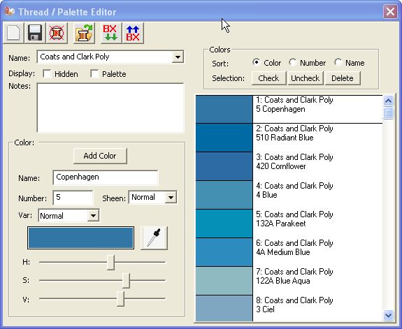 The color grabber tool will let you click in any window and pick up whatever color is under the cursor. This is very useful when you are building a thread palette from a document such as a .pdf or a thread manufacturer’s webpage. If you want to adjust the color visually, use the HSV (Hue, Saturation, Value) sliders until you get a color that you like.